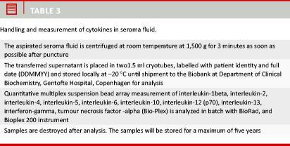 Material and methods: This was a double-blinded and randomized study of injection of methylprednisolonacetate versus saline in the mastectomy cavity at the time of drain removal. A total of 160 females were enrolled after mastectomy. The study parameters were as follows: seroma volume, number of seroma punctures, frequency of clinical infections, degree and type of subclinical colonization, complications and evaluation of the microbiological results of the stix test with automatically read glucose, ketones, blood, pH, protein, nitrite and leucocytes. The degree of inflammation was monitored by measurement of 15 cytokines in each sample of seroma fluid. The study was initiated in August 2010 and is expected to run for three years.