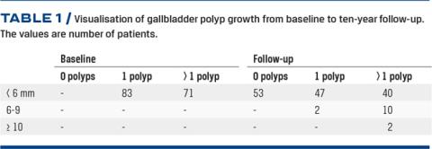 Introduction: Gallbladder polyps often have a benign appearance by ultrasonography. Even so, the current guideline recommends follow-up in gallbladder polyps < 6 mm. The aim of this study was to investigate long-term follow-up growth of polyps in patients with a polyp size < 6 mm in a ten-year cohort.