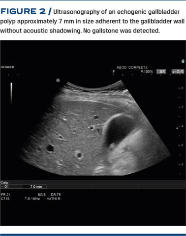 All technical parameters such as gain and focus were adjusted individually. Polyps were identified if the lesion was immobile without acoustic shadowing. Its largest diameter was measured in mm using an electronic ruler. An increase of polyp size of 2 mm was considered a significant growth. If potential gallstones were detected, this was documented by the presence or absence of acoustic shadowing. A picture archive communication system was used to store all imaging and ultrasonography reports. Figure 2 shows ultrasonography of an echogenic gallbladder polyp approximately 7 mm in size without acoustic shadowing.