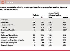 Introduction: The aim of this retrospective case series is to describe the epidemiology, symptoms and findings of acute epiglottitis in hospitalized patients after the introduction of the Haemophilus influenzae type B (HIB) vaccine and to identify any symptoms or findings predictive of a prolonged hospital stay.