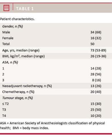 Results: A total of 50 patients were included in this analysis. Sixteen were female, the median age was 73 years, and the median BMI was 26 kg/m2. Furthermore, the American Society of Anesthesiologists (ASA) scores were as follows: ASA 1 (28%), ASA 2 (60%), and ASA 3 (12%); their tumour-node-metastasis (TNM) staging was TNM: ≤ T2 (30%), T3 (50%), and T4 (20%); and 26% had received neoadjuvant radiotherapy, whereas 40% had received chemotherapy. A total of three patients (6%) developed a post-operative pelvic sepsis. The median length of post-operative hospitalisation was 9.5 days. Overall mortality was 4% (n = 50). The most frequent surgical complication to intersphincteric proctectomy was perineal wound infection, occurring in 20%.