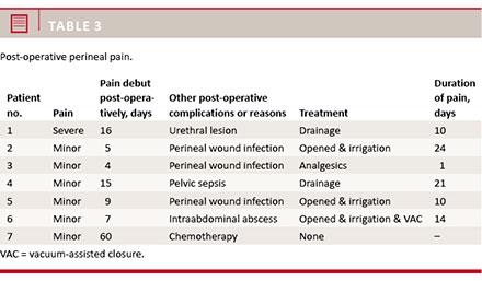 One patient had uncharacteristic perineal pain two months after surgery, which started after treatment with chemotherapy. A total of 6/7 patients reported mild perineal pain, and all symptoms subsided after treatment of the underlying reason was initiated