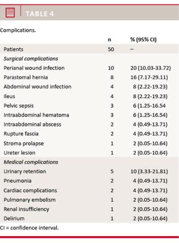 The median time for healing of the perineal wound was 22 days (11-99 days). Seven (14% (95% CI: 5.89-26.73%)) patients experienced perineal pain after the operation. Three of these had perineal wound infection, one had pelvic sepsis, one had an intraabdominal abscess and one had an urethral lesion.