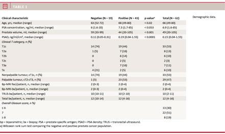 The following preoperative criteria were used to evaluate positive TRUS-bx as clinically significant: a) a GS ≥ 7, b) ≥ 3 positive biopsy cores or c) cancer extension ≥ 50% per biopsy. Furthermore, a PSA > 10 ng/ml in combination with a GS of 6 was deemed clinically significant. On MRI target biopsies, the criteria were GS ≥ 7, cancer extension ≥ 50% per biopsy or a PSA > 10 ng/ml.