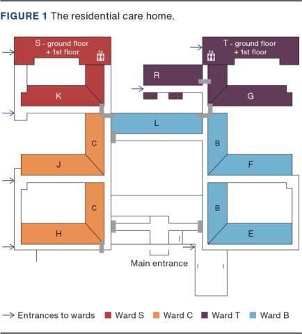 The outbreak occurred at a 114-bed residential care home situated in the Capital Region of Denmark. All resident homes were single bedrooms with separate washing and toilet facilities. The care home had four units counting a total of 76 long-term care beds primarily located at wards B, C and S, and two beds at Ward T. Furthermore, the care home had 38 short-term care beds located at ward T and eight at ward B (Figure 1). The care home had 193 staff in total, including 52 temporary staff members. Healthcare personnel worked in one unit only, whereas technicians, kitchen and cleaning staff and physical therapists visited and worked temporally at all four units.