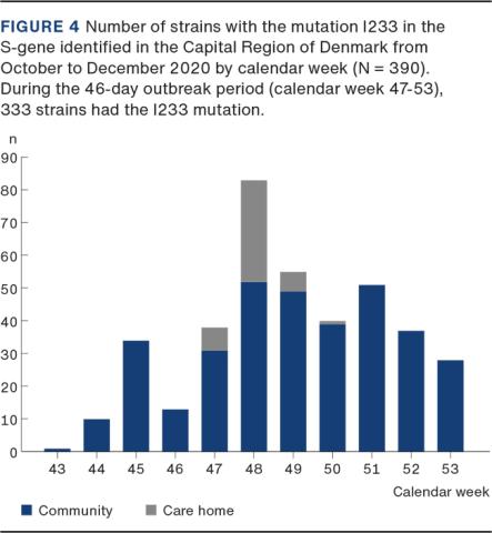 WGS analysis. To determine genetic relatedness of the SARS-CoV-2 identified at the care home, samples from 31 out of 56 (55%) residents and 15 out of 49 (31%) staff members underwent WGS analysis. 53% (41/77) of the positive samples were sequenced at the RH/HH; 18% (5/28) at the SSI. Phylogenetic analysis revealed closely related genomes containing 36 identical genomes, eight genomes with 1-3 mutation differences and one genome with four mutation differences (Figure 3). The eight genomes with 1-3 mutation differences were interpreted as probably related based on the phylogeny and epidemiological data. In addition, three staff members had SARS-CoV-2 genomes distinctly different from the outbreak lineage and from each other. Residents from all four wards and staff were distributed across the lineage. The outbreak lineage belongs to Global Lineage B.1.1.29 and contains the mutation I233V in the S gene. The first case with the outbreak lineage in the Capital Region of Denmark was identified in the community on 19 October 2020; 28 days before the first identified case at the care home (Figure 4). According to the Danish Covid-19 Genome Consortium, approximately 9,000 genomes sequences were produced during the 46-days outbreak period of which 333 (4% of the genomes) belonged to the outbreak lineage [14].