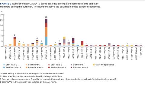 Altogether 81% of the COVID-19 infections occurred within the first three weeks of the outbreak. The last diagnosed case among residents occurred on 30 December 2020; among staff, on 1 January 2021. Thus, the duration of the outbreak was 46 days. Vaccination of residents and staff against COVID-19 was initiated on 5 January 2021.