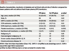 Data were expressed as medians with interquartile ranges for continuous variables and percentages of the total for categorical variables. We divided the cohort into two groups, one received FFP transfusions during the seven-day observation period, the other did not. Also, comparisons were made between days with and without transfusion. The Mann Whitney test was used for continuous variables and the χ2-test for categorical data. Paired data were analysed by Wilcoxon matched-pairs signed rank test.