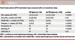 On days of transfusion international normalized ratio (INR) (p < 0.0001), invasive procedures (p < 0.0001), episodes of bleeding (p < 0.0001), numbers of units of saline-adenine-glucose-mannitol stored red blood cell (SAG-M) (p < 0.0001) and platelets (p < 0.0001) were significantly higher than on days with no transfusion (Table 2 ). When given, the number of units of FFP was between one and eight; two units were given on 56% of the total transfusion days.