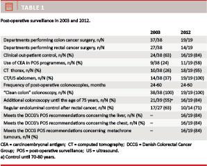 In 2003 the pattern of POS after intended curative CRC operations in Denmark was evaluated with regard to diagnosis of local and distant recurrence and diagnosis of metachrone cancers [5]. At that time, patients with CRC were operated at a total of 38 departments. In all, 28 of these departments (74%) offered their patients a POS programme. Diversity in the choice of surveillance modalities as well as in the frequency of the use of these modalities was observed.