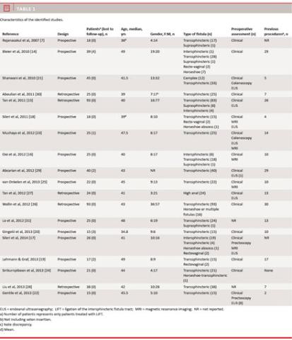 virus or IBD. Sirikurnpiboon et al [24] excluded patients with IBD and superficial fistulas. Gentile et al [22] excluded patients with IBD, high-grade haemorrhoids and patients with weakened continence. The report by Gingold et al [20] is, to date, the only study that solely included patients with Crohn’s disease. As shown in Table 1, most studies included patients who had previously