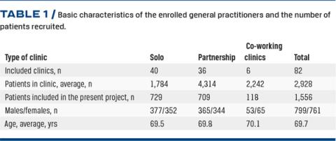 Among the 82 participating GP clinics, approximately half were solo general practices and the rest were partnership clinics. Records of 1,556 COPD patients (51.3% males) with an average age of 69.7 years (range: 36-97 years) were included in the study (Table 1).