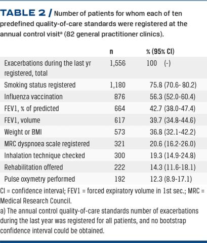In more than 50% of the patient journals, no more than three of the ten quality-of-care standards were registered at the annual COPD-control visit. These were: number of exacerbations during the past year, smoking status and vaccination against influenza. The remaining seven quality-of-care standards were recorded only between 12% (95% CI: 8.9-17.1%) and 43% (95% CI: 38.0-47.4%) with the measurement of peripheral oxygen saturation by pulse oximetry as the lowest. Only 1.3% (95% CI: 0.4-4.7%) of the 1,556 patients had all ten standards of care documented in their electronic record form. Only 28% (95% CI: 23.1-33.0%) of the patients had six or more quality-of-care standards registered, whereas 10% had just one quality-of-care standard registered. The mean number of registered quality-of-care standards was four.