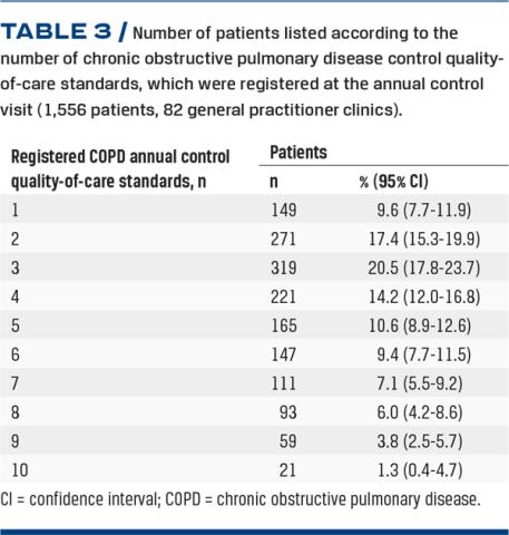 Results: In total, 82 GP clinics participated in the study. Approximately half were solo clinics and the rest were various types of partnership clinics. The records of 1,556 COPD patients (51.3% males) with an average age of 69.7 years (range: 36-97 years) were included. We found the level of registration of the quality-of-care standards to be very low, as only 11.1% (95% confidence interval: 7.9-15.8%) of the PMR recorded an acceptable (80-99%) or excellent (100%) registration.