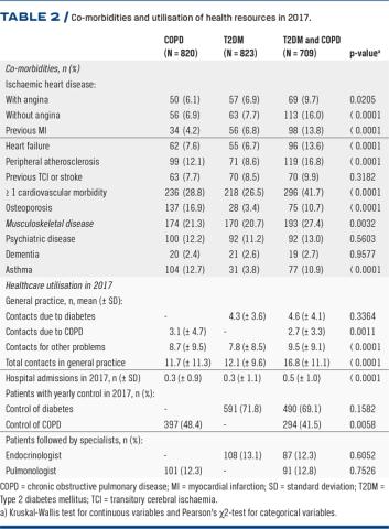 RESULTS: Formalised annual control visits were completed in 72% of the patients with T2DM and 48% of the patients with COPD. Approximately 13% of the patients were followed by a specialist. Patients with both diseases had the highest number of healthcare contacts but the lowest fulfilment of annual control visits. The standard of care was fair, although assessment of the disease characteristics of COPD was less complete in patients with both conditions. Cardiovascular diseases including heart failure were significantly more common in patients with both conditions (42%) than in those with COPD only (29%) or T2DM only (27%).