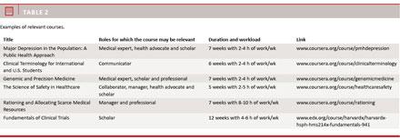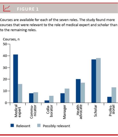 Results: We agreed the most on the role of health advocate (Cronbach’s α = 0.85) and the least on the role of collaborator (Cronbach’s α = 0.46). After a consensus-building process, 165 courses were found to be relevant or possibly relevant, mostly to the roles as scholar (n = 75) and medical expert (n = 57). The courses had a median duration of seven weeks and a median weekly workload of 4.5 hours, and were predominantly from North American universities.