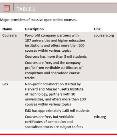 Massive open online courses (MOOCs) are free online classes in which anyone, anywhere, can participate [10]. MOOCs are typically based on weekly video-based lectures composed of several shorter video sequences, each 5-10 minutes in length [10]. Video sequences are typically accompanied by questions; and completion of homework, assignments, or participation in case discussions may be required on a weekly basis to provide an interactive learning experience. One unique feature is the diversity of discussion that may arise when engaging thousands of students. Feedback on homework and assignments is provided by peers, aided by instructions on how to provide feedback and what kind of feedback to give. Currently, two major MOOC providers – Coursera and EdX (Table 1) – offer hundreds of freely available courses. This service is considered a potential game changer in continuous medical education and postgraduate training [6, 11]. However, there has been no systematic investigation into the relevance of the great pool of MOOCs for postgraduate medical training.