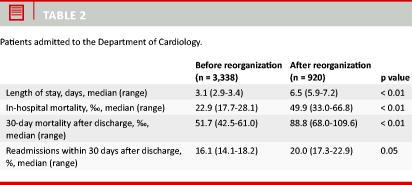 As can be seen from Table 2, the number of patients admitted to the Department of Cardiology was dramatically reduced to around one third. Only those who could be expected to stay in the hospital for more than 48 hours and those who suffered from complicated or severe cardiac disease were transferred to the Department. All other cardiac patients were treated at the MAU and dismissed from there. As expected, the patients at the Department of Cardiology now stay longer, have higher mortalities and are more often readmitted to the hospital – which is a natural consequence of the increased severity of their conditions.