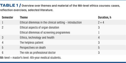 At Aarhus University, Denmark, medical students receive training in biomedical ethics both at the bachelor’s (BA) (pre-clinical) and the master’s (MA) level. At the MA level, students receive short seminars in bioethics during every semester that relate directly to the clinical practice they are about to experience during rotations (see Table 1).
