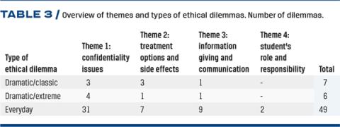 RESULTS: The thematic analysis of 51 group reflection texts (n = 396) revealed four key themes in the material: 1) confidentiality issues, 2) treatment options and side effects, 3) the students' role and responsibility and 4) information-giving and communication. The majority of the ethical dilemmas that the students identified were everyday dilemmas. Dramatic dilemmas were represented to a limited degree.