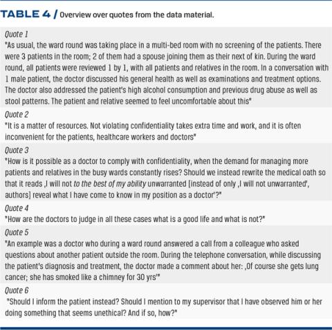 The students described how doctors often debated the level of treatment for patients and decisions concerning resuscitation of seriously ill and mentally despaired patients. Reflections showed how all these were embedded in ethical dilemmas (see Table 4, Quote 4).