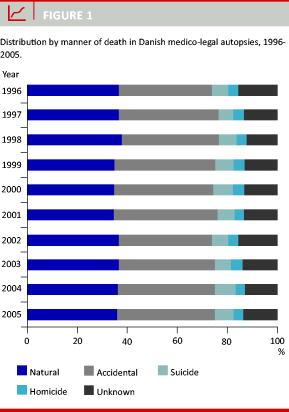The distribution by manner of death (natural death, accidental death, suicide, homicide or unknown) was relatively constant throughout the study period as shown in Figure 1. 35-38% of all medico-legal autopsies were natural, 37-41% accidental, 6-9% suicides, 3-5% homicides and 12-15% unknown.