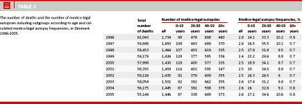 By using the medico-legal autopsy frequency, inter-country comparison can be made. Great differences exist between the Nordic countries as medico-legal autopsy frequencies vary from around 4% in Norway and 6% in Sweden to 24% in Finland [2-6]. The Danish medico-legal autopsy frequency was 2.3% in 1967 and 2.7% in 1970 [7]. To our knowledge, no studies have investigated recent frequencies and trends in Denmark.