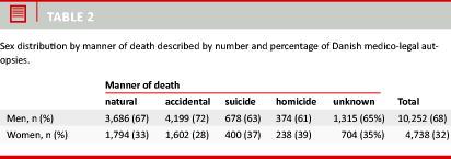 In a Norwegian study, the corresponding figures were approximately 66% and 58%, respectively [10]. In Sweden, the overall medico-legal autopsy frequency in unnatural deaths (suicide, homicide and accidental deaths) is 68% [11]. The Finish frequencies reach 99.5% in suicides and 87.2% in accidental deaths [3]. These divergent autopsy frequencies can be ascribed both to differences in legislation and in request behaviour among the police, and they may also be ascribed to differences in the assessment of the importance of performing an autopsy as well as to economic priorities [1-6, 12].