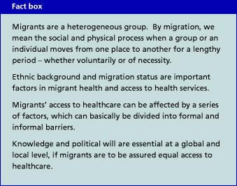 But effective political initiatives require knowledge. This research area is still facing a lot of challenges, including questions of method. The development and operationalisation of ethnicity and migration are decisive, as is the establishment of information systems for the collection of nuanced knowledge about ethnic background, health and contact with the health services. In relation to contact with the health services, it is important to research both quantitative patterns of use and the qualitative experience of migrants in using the health services. Furthermore, we also lack knowledge of the options for intervention and its effect among migrants. A special topic, on which we have almost no information, is the way all these things change over time for migrant groups after they have arrived in the new country and for second and third generation migrants in the light of ethnic background, kind of migration, and conditions in the country receiving them [10]. Information on migrants' access to healthcare is generally inadequate in Denmark, but almost totally non-existent in most low and middle income countries. The problems in these countries are on quite a different scale because of the many international and internal migrants, local accumulation in slums and refugee camps, widespread health problems, and strained health systems that were already inadequate for the local population. ( Box 1 )
