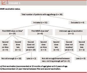 Material and methods: Data collected through evaluation of the histories of children referred to the Paediatric Ward at Hillerød Hospital from 01.01.2008 to 28.02.2011 and coded according to action diagnosis and/or supplementary diagnosis in International Classification of Diseases 10 (ICD-10) for food allergy, oedema angioneurotica and tentative diagnosis as well as the procedure code for oral food challenge. A total of 32 patients were included, all were both sensitized to egg and had been MMR vaccinated.