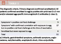 The diagnostic criteria are presented in Table 1. Oral challenge with egg was carried out 18 times in all on a total of 12 patients. Eleven were positive, one was inconclusive and six were negative in patients who had all shown definite allergic reactions to egg. Of the 12 patients, nine were positive. The three patients with negative oral challenges had all been challenged following the first MMR vaccination. At the time of vaccination, a definite positive anamnesis of reaction to egg existed for these three patients. Five patients presented with asthmatic symptoms when provoked with egg, three patients showed no asthmatic symptoms, and in four cases information was missing from the medical history.