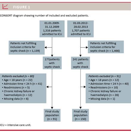 given by the clinician as stated in the department’s documentation system (Critical Information System (CIS) Daintel ApS, Copenhagen, Denmark). The inclusion critria were ICU admission with septic shock during the study period. To ensure that all patients with septic shock were included in the study, we identified all patients with the following diagnostic codes: sepsis, severe sepsis or septic shock. Each patient was then followed for the first 14 days of their ICU stay or until discharge or death. Each patient’s medical record was reviewed and assessed in order to identify septic shock and any presence of clinical infection. Any treatment with one of the following vassopressors was recorded: norepinephrine, epinephrine or dopamine. Patients were registered as being in shock if they had a systolic blood pressure (BP) measured invasively or non-invasively below 90 mmHg for more than 1 hour without any external cause.