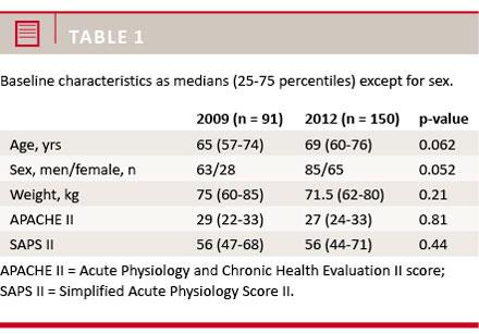 Data from 241 patients were collected; 91 patients in the dextran-group and 150 patients in the non-dextran group. Data were collected for the first 14 days in the ICU. Baseline characteristics were similar between the two groups (Table 1).