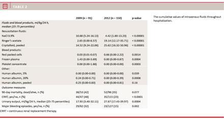 The daily amount of the following fluids and blood products was recorded. The following crystalloids were recorded: NaCl 0.9% and Ringer’s acetate. Synthetic colloids and blood products: HES 130/0.38-0.45 (Voluven 60 g/l sodium chloride), dextran-70 (Macrodex 60 g/l sodium chloride), packed red blood cells in SAGM solution (SAGM: saline, adenosine, glucose, mannitol), frozen plasma, platelet concentrate, human albumin 5% and human albumin 20%. In this study, only fluids received in the ICU were registered, whereas fluids given in the ward and emergency room were not.