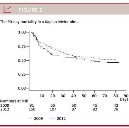 within 90 days compared with 35% in the control group (Table 2) (p = 0.0769). The 90-day mortality is also presented in a Kaplan-Meier plot (Figure 2). In the dextran group, a significant difference was seen in the use of CRRT compared with the non-dextran group. 48% of patients in the dextran group received CRRT, whereas only 23% in the non-dextran group received CRRT (p = 0.004).