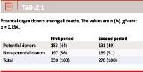 The ratio of potential to non-potential donors is shown in Table 1. Among the potential donors, the ratio of donors to non-donors is shown in Table 2.