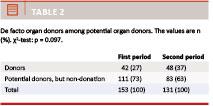 Among the de facto donors, the number of cases where consent is given by the organ donor prior to illness doubled from the first to the second period.
