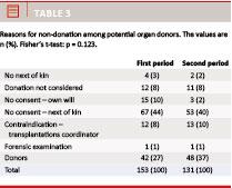 The reasons for non-donation among potential organ donors are shown in Table 3. The main reason for non-donation among the potential donors was refusal to donate by the next of kin. The largest change observed between the two periods was the decrease in refusal to donate from the patient himself/herself prior to illness.