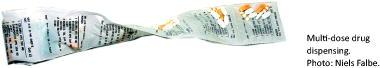 Multi-dose drug dispensing (MDDD) signifies that the patient’s medicine is packed in one unit, a disposable bag, corresponding to the dose he or she needs to take during the course of one day. Each dose unit bag contains all drugs intended for that dose occasion and is labelled with patient data, drug contents, and date and time of intake.