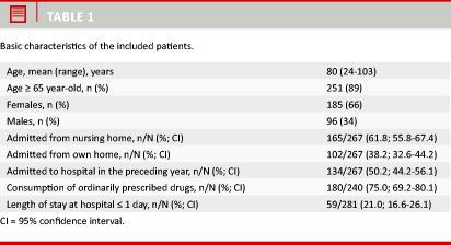 Table 1 shows the basic characteristics of the included patients. Almost 62% of the patients were admitted from nursing homes. Fifty percent of the patients had been admitted to hospital in the preceding year and 75% were consuming additional, ordinarily prescribed drugs.