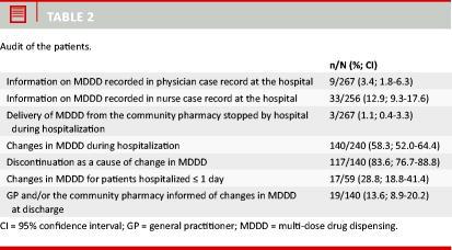 Table 2 presents the results of the audit. Information on MDDD was recorded in the physician case record for 3.4% of patients and in the nurse case record for 12.9% of the patients. Delivery of MDDD to the patient’s home was actively stopped during hospitalization for 1.1% (95% CI: 0.4-3.3%) of the patients. Changes in MDDD during hospitalization were made for 58.3% (95% CI: 52.0-64.4%) of the patients, among whom 83.6% (95% CI: 76.7-88.8%) had discontinued one or more MDDD drugs. Data not shown. Changes were made for 28.8% (95% CI: 18.8-41.4%) of the patients who were hospitalized for one day or less. The GP and or the community pharmacy were informed of changes in MDDD for 13.6% (95% CI: 8.9-20.2%) of the patients.