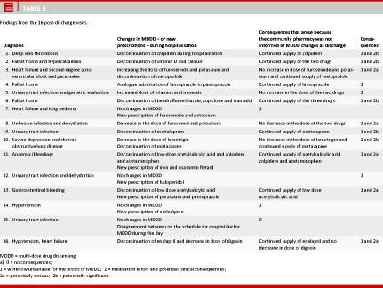 Results: Almost 9% of the patients were receiving MDDD on admission. Information on MDDD was recorded in the physician case record for 3.4% of patients and in the nurse case record for 12.9% of patients. Changes in MDDD during hospitalization were made for 58.3% of patients. General practitioners and/or the community pharmacy were notified of changes in MDDD at discharge for 13.6% of the patients. The post-discharge visits and the interview revealed potential issues of concern regarding patient safety.