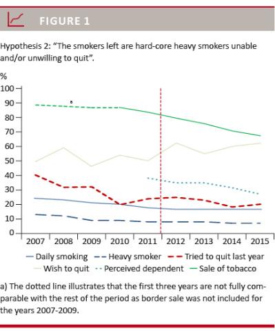 “Perceive myself to be dependent of smoking” was assessed from 2011 and showed a continuous decrease (from 38% to 27% in 2015) in smokers perceiving themselves as being very dependent. “Smokers wish to quit” increased. 62% answered “Yes,