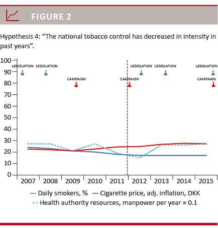It could not be rejected that national tobacco control had decreased in intensity. There had been no nationwide anti-smokingTV campaign for four years, and legislation in the stagnation period was primarily based on minor revisions of existing laws. The Health Authority’s manpower allocated to tobacco control started very low in the first year of the stagnation period, but is now back to the 2007-level. The tobacco price increased in the stagnation period, but only by approx. 2 DKK (0.24 EUR/0.25 USD) per package of cigarettes (adjusted for purchasing power over time).
