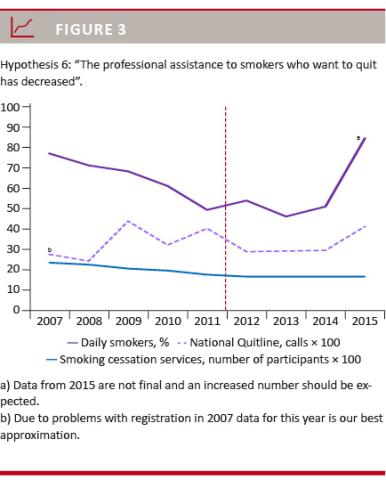 It could not be rejected that assistance to smokers who wanted to quit decreased. There was a steep fall in the number of smokers using national smoking cessation services. At the same time, the national quit-line activities were low in the first three years of the stagnation period. Fortunately, a recent steep increase has been recorded in phone-calls to these services.