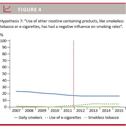 4. National tobacco control has decreased in intensity in recent years; 5. The media has focused less on quitting smoking, 6. Professional assistance to smokers who want to quit has decreased; and 7. Use of other nicotine-containing products, such as smokeless tobacco or e-cigarettes, has influenced smoking rates negatively. All seven hypotheses were investigated.