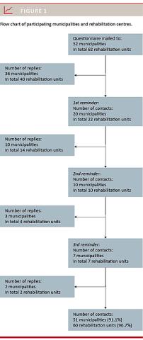 within 56 municipalities were eligible for the survey (Figure 1). The HF responsible physical therapy clinician or manager at the local PR centre was identified and received the electronic questionnaire by e-mail. The participants were invited to complete the questionnaire and to return relevant documents or links to formal descriptions of procedures and/or specific programmes if treatment was conducted according to such in the PR centre. The survey was conducted from 7 February to 8 April 2013. Three reminders were sent. The reporting of the study adheres to the Strengthening the Reporting of Observational Studies in Epidemiology (STROBE) statement for cross-sectional studies.