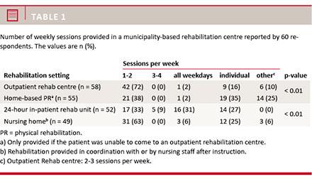 PR provided as home-based, at 24-hour inpatient PR units or nursing homes were more often based on individually adjusted terms regarding sessions per week than PR provided in outpatient centres (Table 1). The number of weekly sessions provided in the different PR settings differed when calculated as outpatient PR centre versus home-based PR (p < 0.01) and 24-hour in-patient PR unit versus nursing home (p < 0.01) (Table 1).