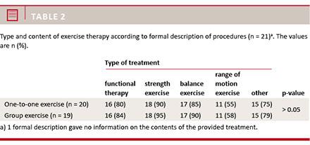 The modalities constituting the PR were exercises of relevant ADL functions, strength and balance (95%), range of motion (67%) or e.g. reduction of oedema or improvement of outdoor mobility skills (86%). Group-exercise PR was described as offered in 90% of the descriptions, aimed and conducted similarly to that reported in one-to-one PR and with no statistically significant difference (p > 0.05) in the distribution of primary contents between the two types of treatment (one-to-one versus group-exercise) (Table 2).