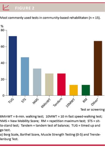 Test or screening of e.g. basic mobility skills or risk of falls at start of PR was described as being conducted in 76% of the forwarded descriptions, but five of these descriptions had no information that any re-test was being performed. The most frequent test in use was the Timed Up & Go test, Sit To Stand test and the New Mobility Score (Figure 2). Use of other tests were common, e.g. the Tandem test, the Six-Minute Walking Test, the 10 Meter Walking Test, Repetition Maximum, Borg scale, Barthel Score, Muscle Strength Testing (0-5) and the Trendelenburg Test.